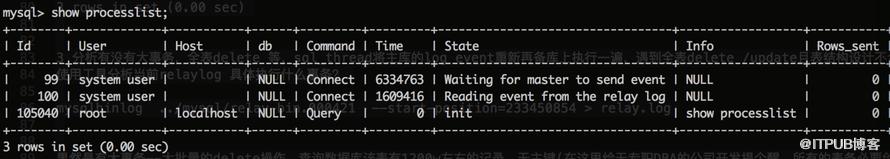 登陆数据库查看 ,备库无任何业务连接,也没有备份在进行。因此可以排除MySQL 锁层面的问题。