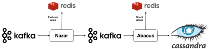 From here, the view-counting system has two components which operate sequentially. The first part of our counting architecture is a Kafka consumer called Nazar, which will read each event from Kafka and pass it through a set of rules we’ve concocted to determine whether or not an event should be counted. We gave it this name because just as a nazar is an eye-shaped amulet protecting you from evil, the Nazar system is an “eye” that protects us from bad actors trying to game the system. Nazar uses Redis to maintain state and keep track of potential reasons why a view should not be counted. One reason we may not count an event is if it’s the result of repeat views from the same user over a short period of time. Nazar will then alter the event, adding a Boolean flag indicating whether or not it should be counted, before sending the event back to Kafka.