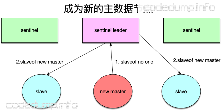 - 哨兵领导者向上一步选出的从节点发出“slaveof no one”命令,让该节点成为主节点。