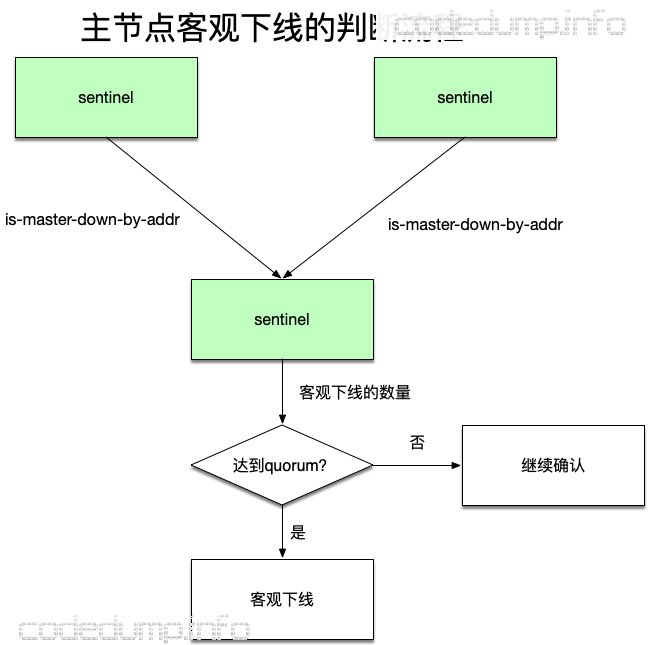 当一个哨兵节点认为主节点主观下线时,该哨兵节点需要通过”sentinel is-master-down-by addr”命令向其他哨兵节点咨询该主节点是否下线了,如果有超过半数的哨兵节点都回答了下线,此时认为主节点“客观下线”。