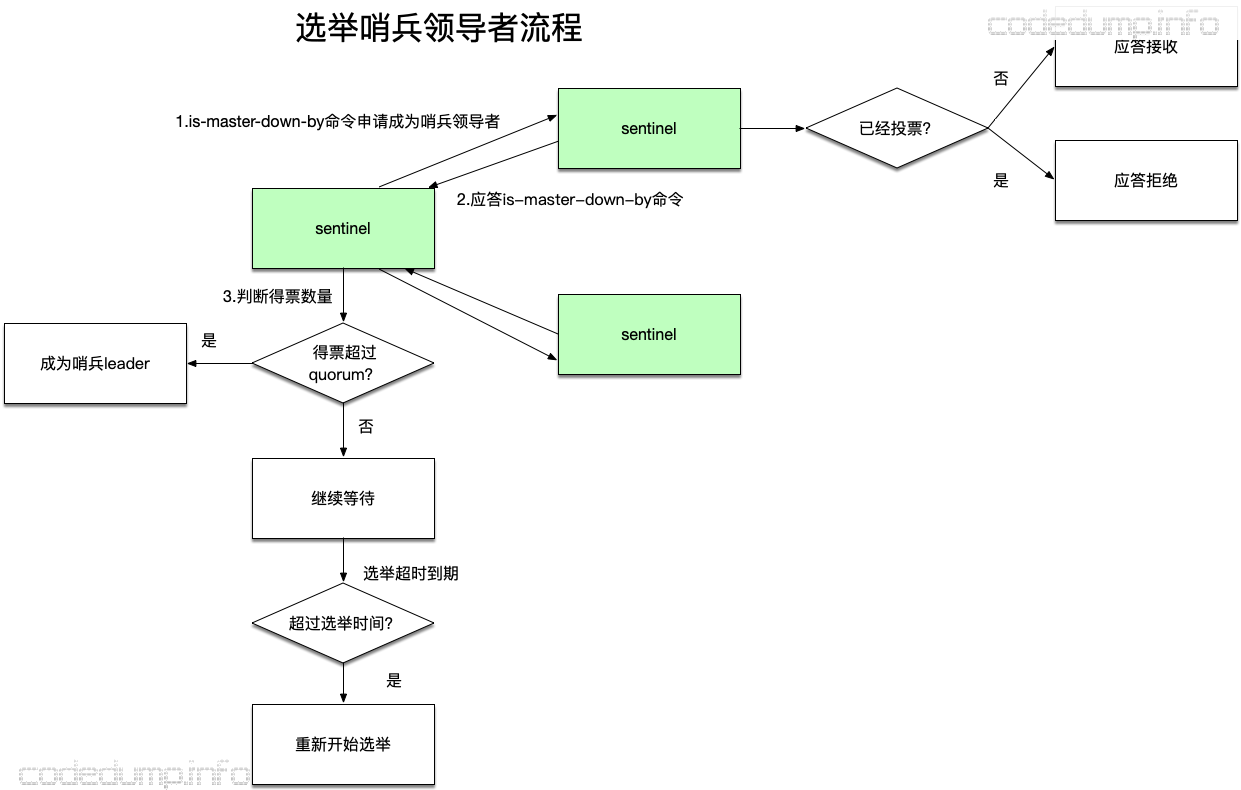- 一旦发现redis主节点失效,将选举出一个哨兵节点作为领导者(leader)。