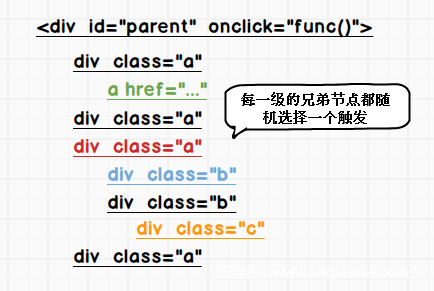 ID为parent的节点存在onclick的内联事件,对其子节点,同一层随机选择一个触发。上图中彩色为触发的节点。