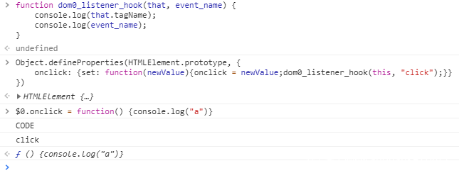 } Object.defineProperties(HTMLElement.prototype, { onclick: {set: function(newValue){onclick = newValue;dom0_listener_hook(this, "click");}}, onchange: {set: function(newValue){onchange = newValue;dom0_listener_hook(this, "change");}}, onblur: {set: function(newValue){onblur = newValue;dom0_listener_hook(this, "blur");}}, ondblclick: {set: function(newValue){ondblclick = newValue;dom0_listener_hook(this, "dblclick");}}, onfocus: {set: function(newValue){onfocus = newValue;dom0_listener_hook(this, "focus");}}, ... ... }) Object.defineProperty(HTMLElement.prototype,"onclick",{"configurable": false});