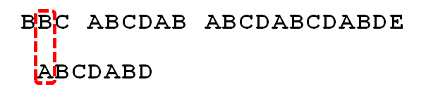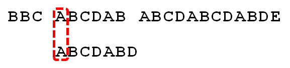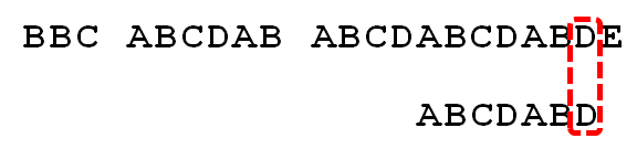 首先,字符串"BBC ABCDAB ABCDABCDABDE"的第一个字符与搜索词"ABCDABD"的第一个字符,进行比较。因为B与A不匹配,所以搜索词后移一位。