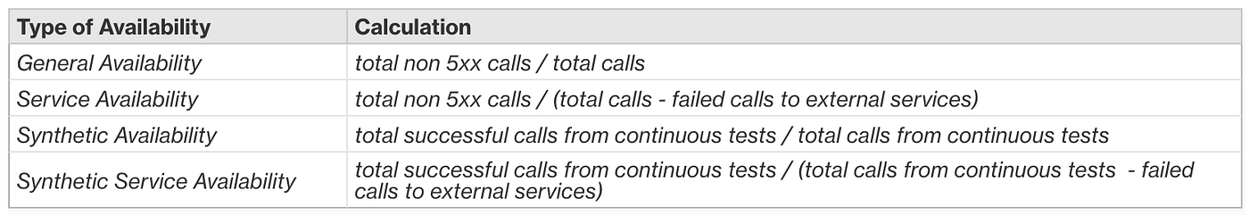 By breaking down availability into these four categories — general availability, service availability, synthetic availability, and synthetic service availability — we are able to pinpoint any weaknesses in the system and identify where to invest to make it more robust.