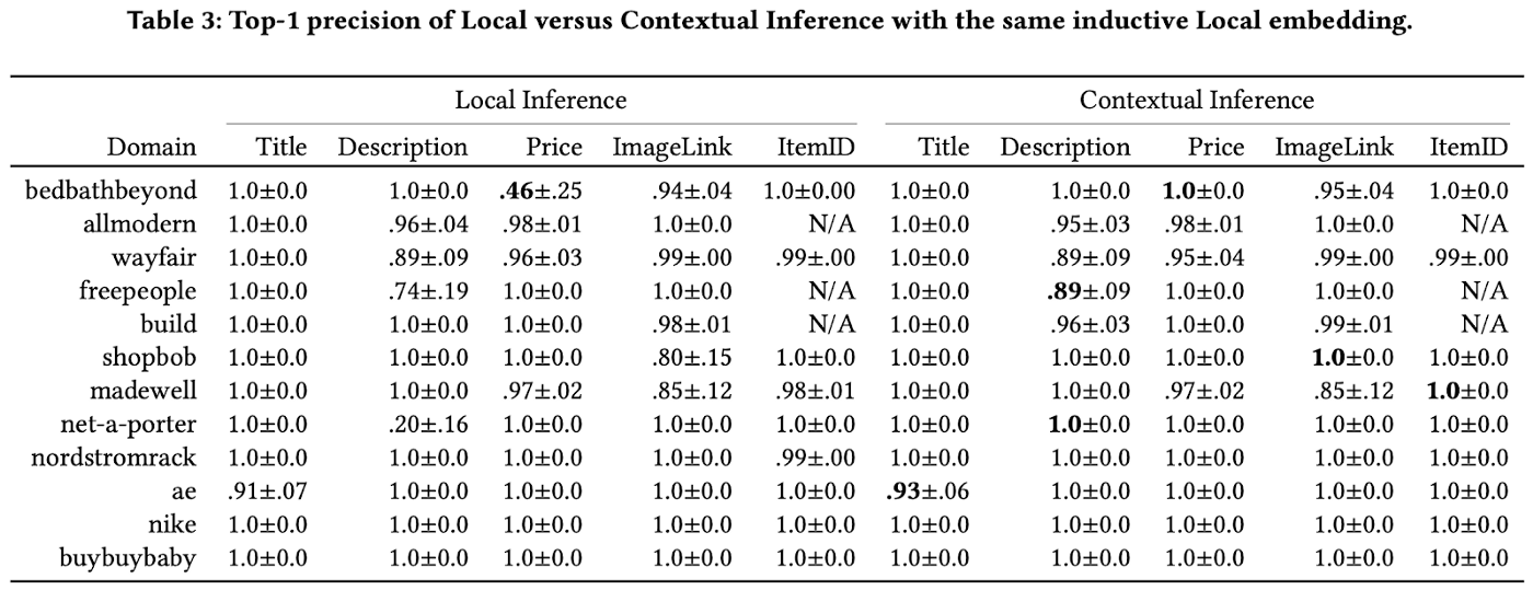 We use the first five domains as the pre-training dataset to learn the inductive embeddings. The remaining four domains are used for the in-domain training purpose when we compare in-domain versus cross-domain training data quality, with 1,000 pages left out for the evaluation purpose. We then collect another top eight shopping domains without any labels. We use the top-1 prediction precision as the metric. We train models and evaluate them as follows: