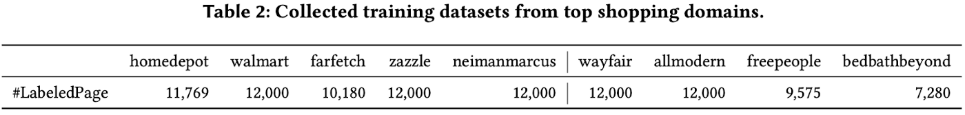Modern websites have significantly more complex webpages than the ones in SWDE. For example, the raw HTML page size can be 10 times larger. Hence, we curated a large dataset from nine shopping domains with varying numbers of web pages as shown in Table 2. This makes the task more challenging and representative of an industrial application. Although we use this system to extract 16 attributes, we show performance only on the five most important attributes; Title, Description, Price, ImageLink, and ItemId.