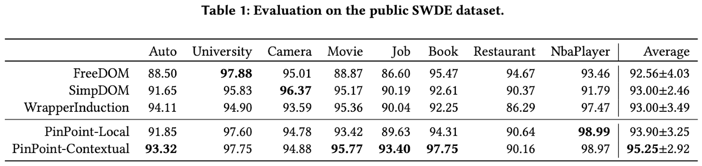 SWDE is the most commonly used public dataset to measure the performance of web attribute extraction algorithms. This dataset contains data for eight verticals, 80 websites, 124K webpages, and 32 attributes. We compare the performance of our model with other state of the art algorithms in Table 1.
