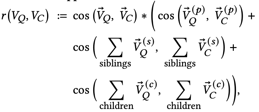where? (?) ∈PARENT(?) is a parentnode,? (?) ∈SIBLINGS(?) denotes a sibling node, and ? (?) ∈ CHILDREN(? ) denotes a child node. We have filtered out the nodes with negative cosine similarity to _V_Q. We use SUM instead of MEAN pooling following GIN, because it is more powerful to encode graph topology information than GCN. We use the graph information at the inference time instead of learning GNN-based node embedding at the training time. The hypothesis is that the graph topology between the query and candidate nodes of the same domain is stronger than that between pages of different domains.