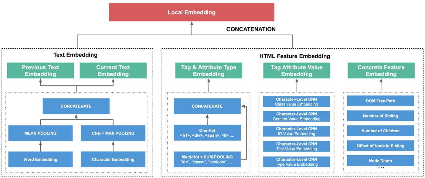 h(?) := CONCAT[ Previous Text Embedding, Text Embedding,Tag Type Embedding,Tag Attribute Value Embedding,DOM Tree Path Embedding,Concrete Feature Embedding],