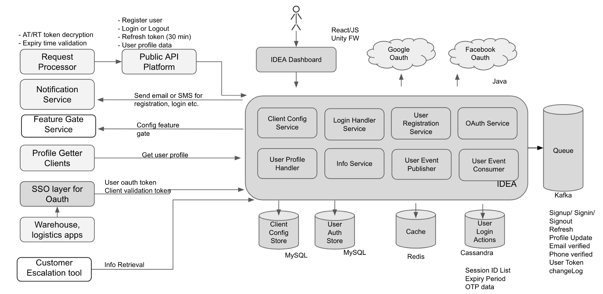 IDEA is a one stop solution for all Identity and Authentication needs of Myntra. Any service or client which needs to an authenticated user to perform its operations would connect with IDEA, create or use an existing user account, authenticate if the user is valid or not, and then perform its operations.