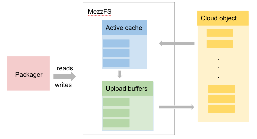 With this packager constraint, there are a number of ways to design a writable MezzFS feature, but we wanted a solution that best fit the IO patterns of the packager in terms of latency, network utilization, and memory usage. In order to do that, the storage cloud object is modeled as a number of fixed size parts. MezzFS maintains a pool of upload buffers that correspond to a subset of these parts. As the packager creates and writes data to the object, data fills up the buffers, which are automatically uploaded asynchronously to the cloud. You can think of packaging as creating a stream of output that is stored directly in the cloud.