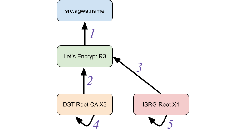 Even though that story is a year old and was well covered then, I’m retelling it here because a couple of weeks ago something kind of similar happened: a certificate for the Let’s Encrypt R3 CA expired (certificate 2 below) on September 30, 2021. This should have been fine; the Let’s Encrypt R3 entity also has a certificate signed by the ISRG Root X1 CA (3) which nowadays is trusted by most clients.