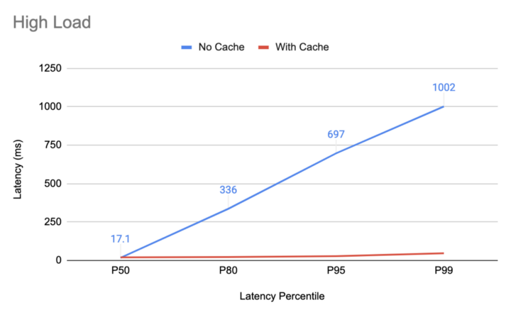 Median latency without caching is half of what we observe with the introduction of the caching mechanism, due to the added synchronization delays. In exchange, the worst-case 99th percentile latencies are 90% lower, dropping from 292 milliseconds without a cache to 30 milliseconds with the cache.