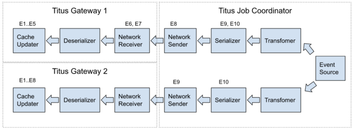 The path over which data travels from Titus Job Coordinator to a Titus Gateway cache can be described as a sequence of event queues with different processing speeds: