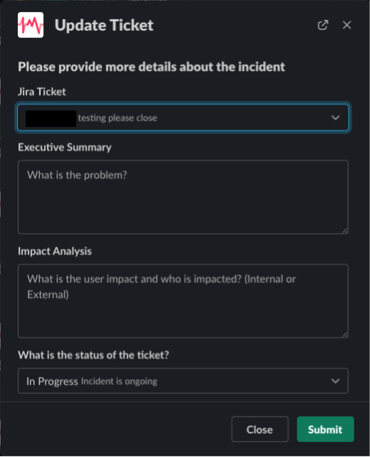 Regardless of the user’s choice to page an incident manager, a popup appears to the user asking for additional information.
