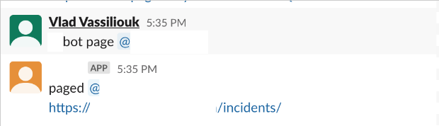 : Create an incident Slack channel for an open incident ticket. - page <service|user>: Page the on-call(s) for a PagerDuty Service or a user directly.