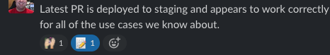 Lastly, after a PagerDuty service is paged using the bot, we don’t have visibility of the status of the PagerDuty incident in Slack. Was the page acknowledged? Did the on-call not respond? Was it escalated and to who? We plan to build automation to follow the PagerDuty incident and report the current status to the incident’s channel. This will also allow us to record the timeline of actions taken in the PagerDuty incident after paging the service.