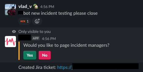 This command creates a blank JIRA ticket with default settings and asks the user if they’d like to page an incident manager.
