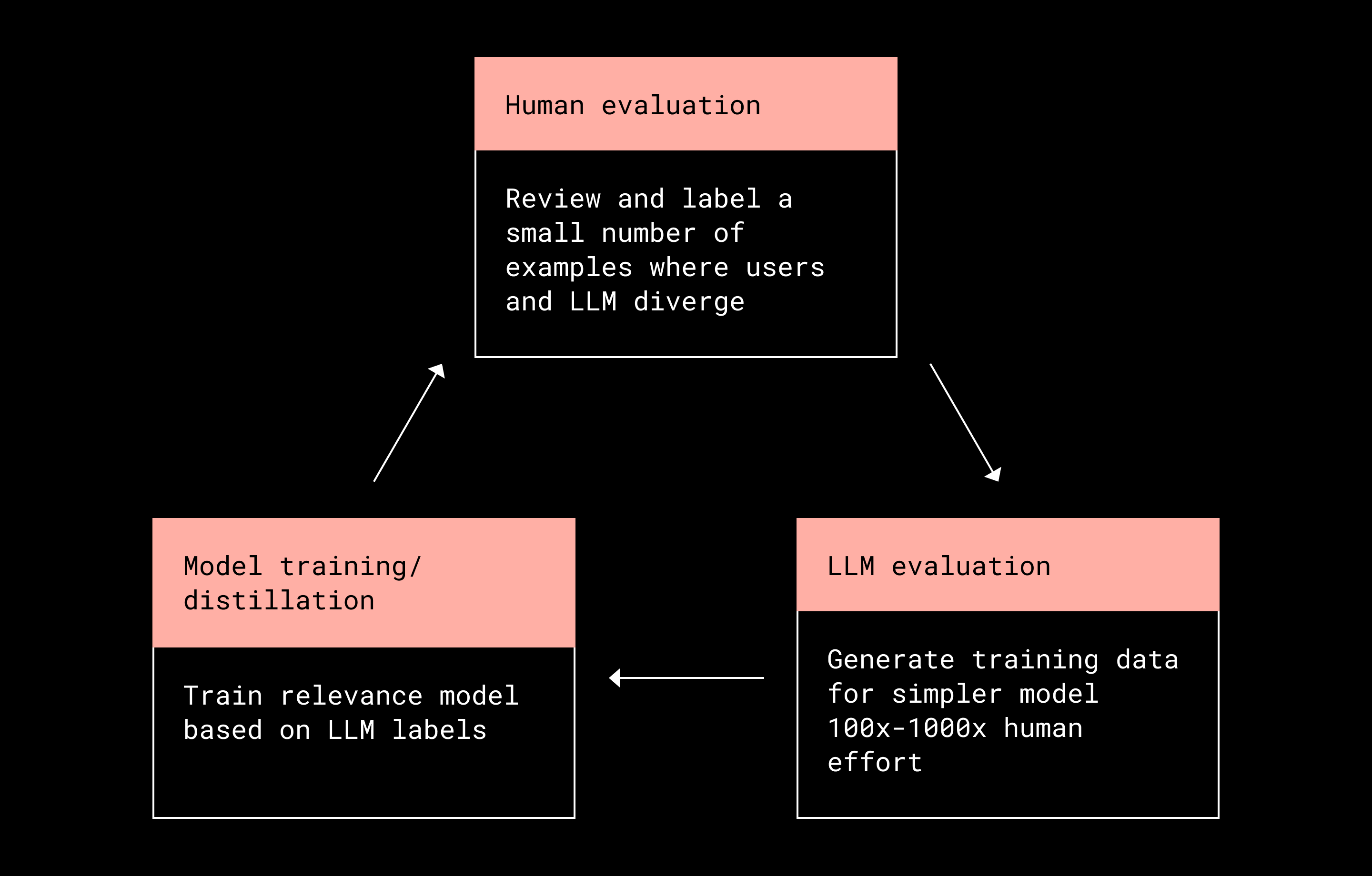 Examples include users clicking on documents the LLM rated as low relevance, or consistently skipping documents the LLM rated as highly relevant. These discrepancies are prioritized for human review and prompt refinement. (These processes are, again, limited to small internal datasets that do not include customer data.) The process is repeated iteratively until major sources of error are addressed or improvements plateau.