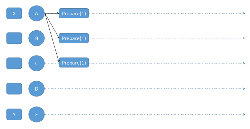 假设现在有五个节点的分布式系统,此时 A 节点打算提议 X 值,E 节点打算提议 Y 值,其他节点没有提议。
