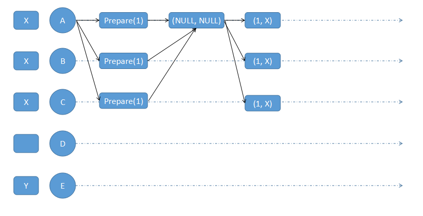 A,B,C 会发生 minProposal 给 A,A 检查发现没有大于 1 的 minProposal 出现,此时 X 已经被选中。等等,我们是不是忘了D,E节点?它们的 acceptedValue 并不是 X,系统还处于不一致状态。至此,Paxos 过程还没有结束,我们继续看。
