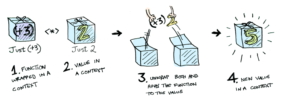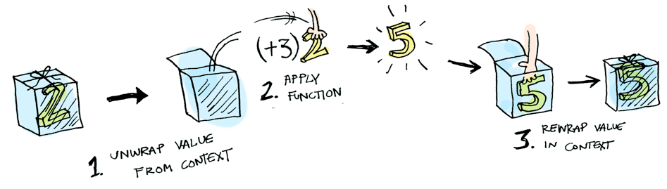 上图中,两个数据类型进行运算。首先,取出它们各自的值,一个是函数,一个是数值;然后,使用函数处理数值;最后,将函数的返回结果再封装进数据类型。