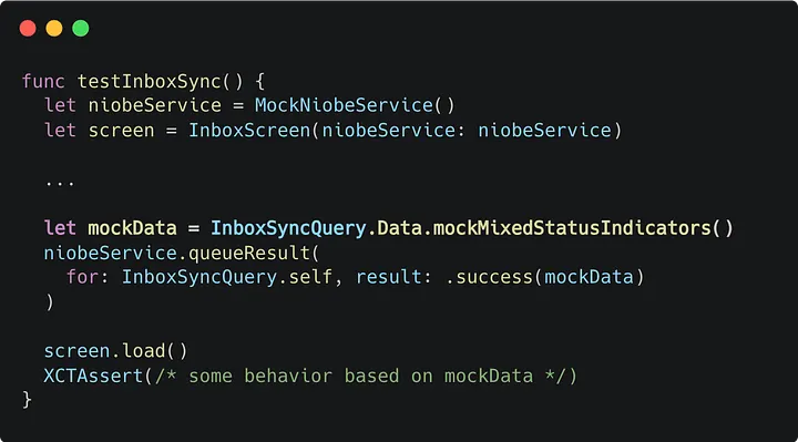 During code generation, Niobe produces both a JSON file containing the actual mock data for each @generateMock directive, as well as a source file that provides functions for loading and consuming mock data from demo apps, snapshot tests, and unit tests. As shown in the Swift code below, the mockMixedStatusIndicators() function is generated on the InboxSyncQuery’s root Data type. It provides access to an instantiated type that’s populated with the generated mock data for mixed_status_indicators, allowing engineers to use the mock without having to load the JSON data manually: