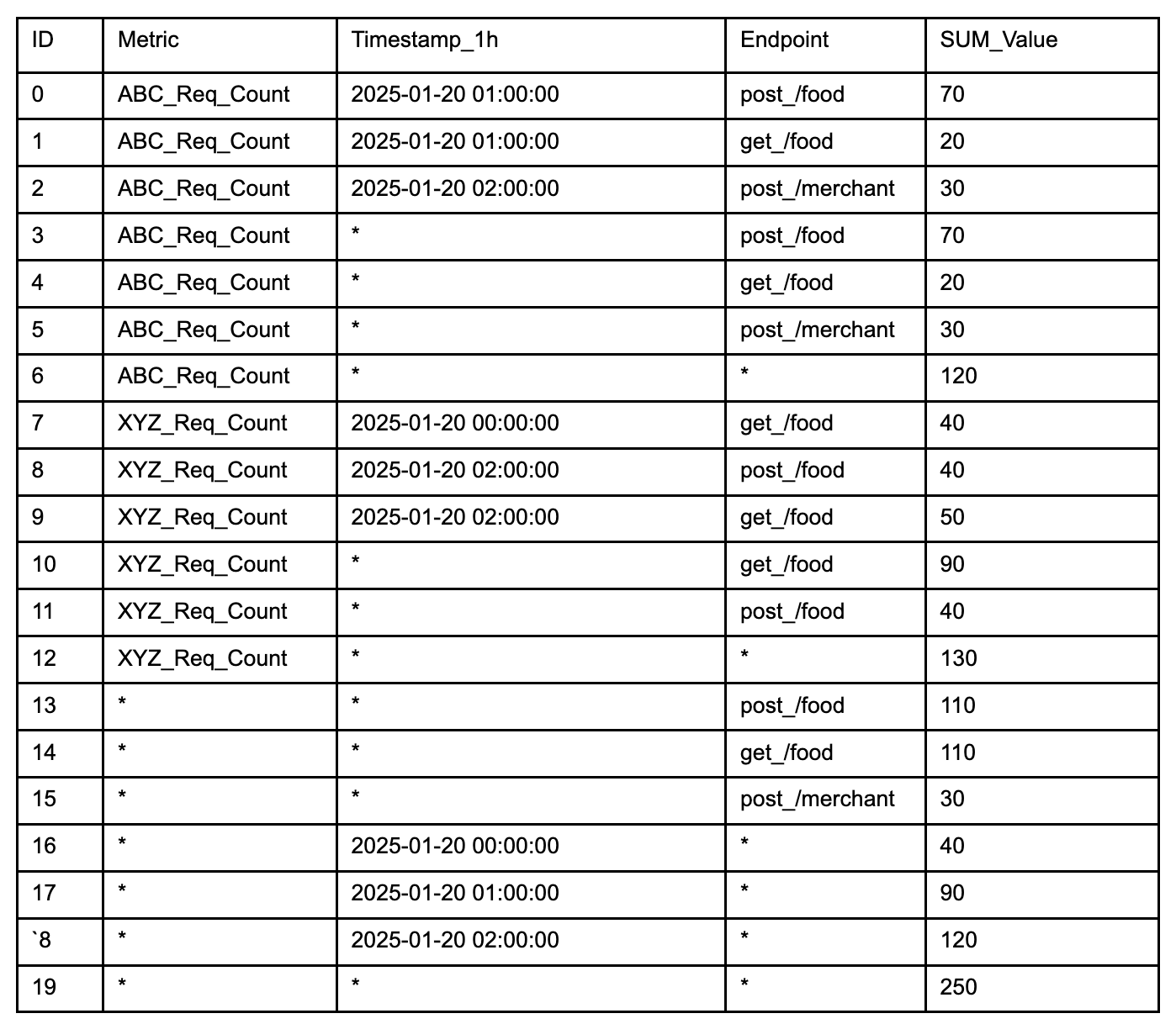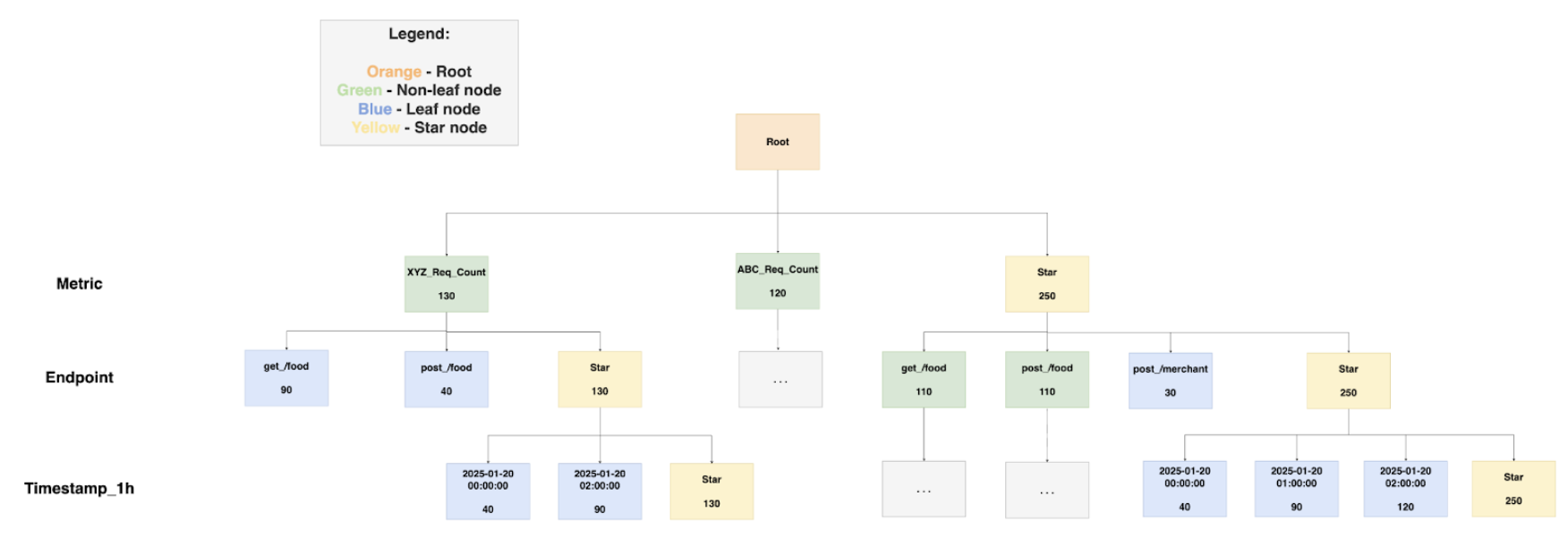 Select the node with XYZ_Req_Count for Metric, and the Star-Node for Endpoint and Timestamp_1h (document 12). This reduces processing to one document, returning an aggregated result of 130, instead of filtering and aggregating three documents (documents 7,8 9) SELECT SUM(Value) FROM Table WHERE Timestamp_1h = '2025-01-20 00:00:00':