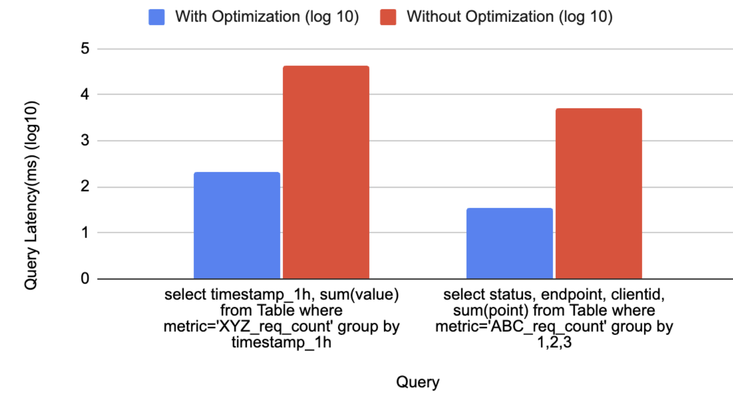 For the first query which calculates the latency for a particular aggregation interval, the log scale indicates a reduction from 4.64 to 2.32, translating to a decrease in query latency from 43,713 to 209 milliseconds.