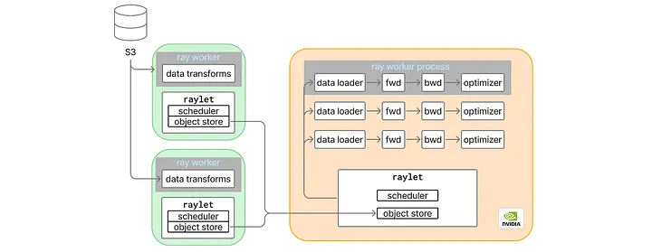 Before we start, let us briefly review the ML model training process. A distributed data parallel ML trainer generally contains these steps: data loading, model forward and backward pass, all-reduce synchronization among GPU ranks, and an optimizer that applies the gradients to model weights. Depending on the model architecture, there may be additional synchronization points during the forward and backward pass. At Pinterest, we also leverage Anyscale’s Ray to horizontally scale the data loader (see here), where the bulk of data transforms are put in a remote CPU worker node, and only a lightweight data loader is kept within the main training process. With such a setup, we not only eliminated the data loading bottleneck, but also unlocked many interesting opportunities (such as Ray Last-mile Data Processing).