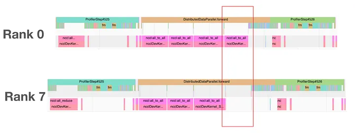 O1.1 led us to do a code search of three-second timers in the Ray repository. We found a few, but changing them made no differences. O1.3 made us suspect Python’s Global Interpreter Lock (GIL). Both Ray and PyTorch make extensive use of C++ extensions. Maybe in some other thread the GIL wasn’t properly released causing the main thread to be stuck? However it turned out to be challenging to verify this hypothesis since the PyTorch profiler doesn’t capture GIL events, and we cannot rely on the Nsight System due to O1.4, which itself was quite a mystery. O1.5 allowed us to focus on a single GPU rank without spending effort to find which rank stalled.