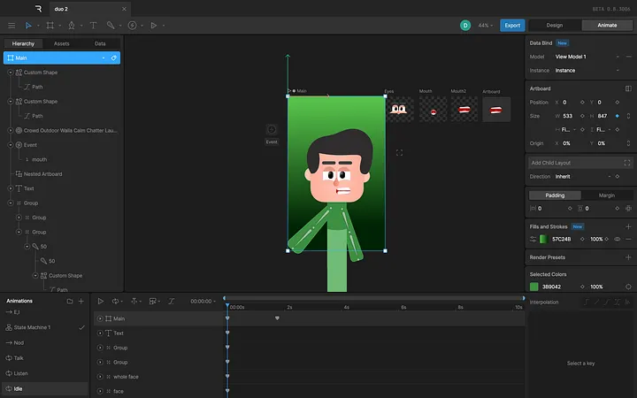 Next, I brought all the pieces into Rive. If you haven’t used Rive, it’s a tool made for real-time, interactive animations, and it’s a game-changer.