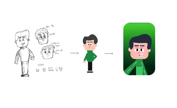 Dew’s journey: from early pencil sketches, to a vector-based character, to a fully animated avatar.