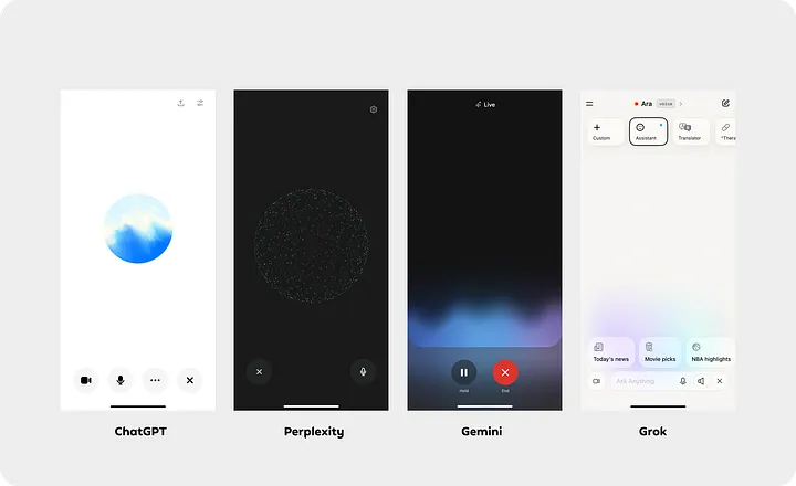 Most AI interfaces today have settled on a visual language that’s instantly recognisable: abstract orbs, smooth gradients, and playful animations. ChatGPT and Perplexity use orbs that pulse or shimmer, Gemini and Grok go with gradient waves, and Perplexity even lets you “touch” the AI, making the orb react with a dynamic particle system. Honestly, these are great design choices.