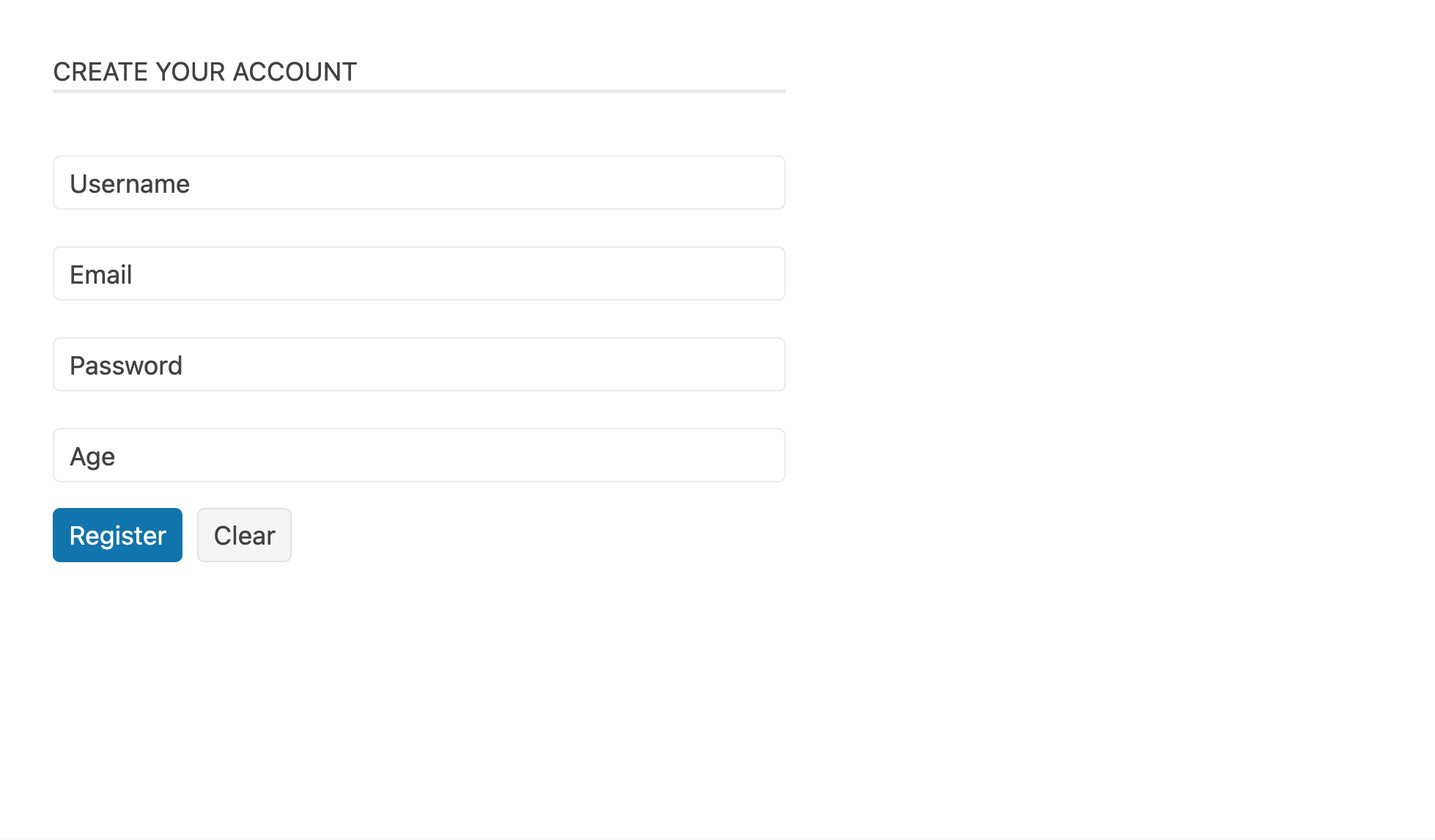 }; const App = () => { const handleSubmit = (dataItem: { [name: string]: any }) => { console.log('Form submitted:', dataItem); }; return ( <Form onSubmit={handleSubmit} render={(formRenderProps: FormRenderProps) => ( <FormElement style={{ maxWidth: 400 }}> <fieldset className={'k-form-fieldset'}> <legend className={'k-form-legend'}>Create Your Account</legend> <Field name={'username'} component={FormInput} label={'Username'} /> <Field name={'email'} component={FormInput} label={'Email'} type={'email'} /> <Field name={'password'} component={FormInput} label={'Password'} type={'password'} /> <Field name={'age'} component={FormInput} label={'Age'} type={'number'} /> <div className="k-form-buttons"> <Button themeColor={'primary'} type={'submit'} disabled={!formRenderProps.allowSubmit} > Register </Button> <Button onClick={formRenderProps.onFormReset}>Clear</Button> </div> </fieldset> </FormElement> )} /> );