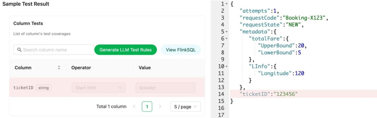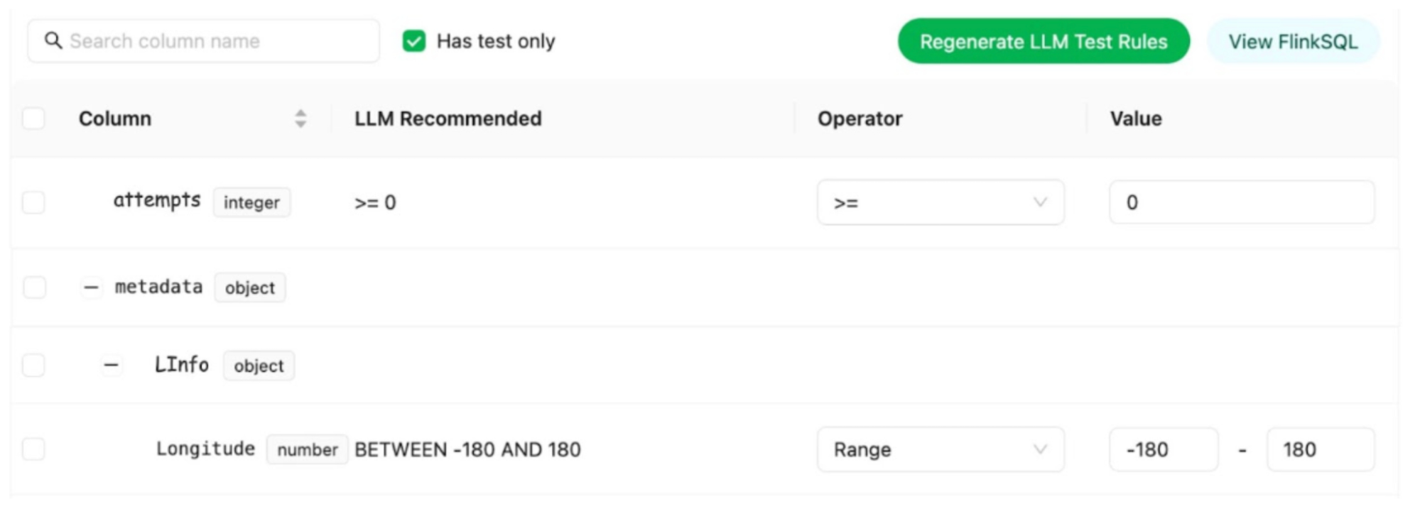 Figure 2. Sample UI showcasing LLM-based Kafka stream schema field-level semantic test rules. Note that the data shown is entirely fictional.