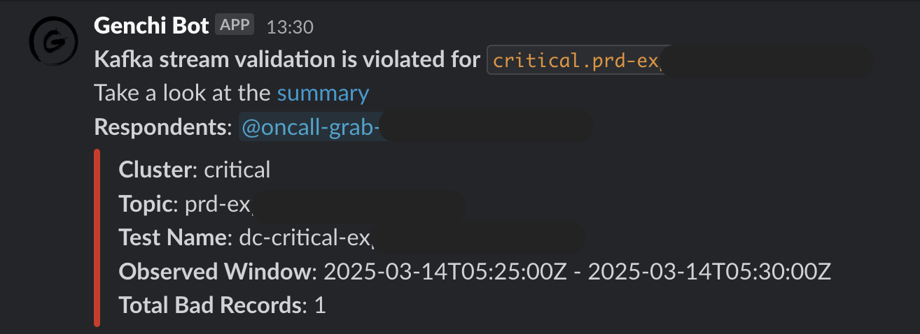 Genchi sends Slack notifications (Flow 3.5) to stream owners specified in the data contract observability metadata. These notifications include detailed information about stream issues, such as links to sample data in Coban UI, observed windows, counts of bad records, and other relevant details.