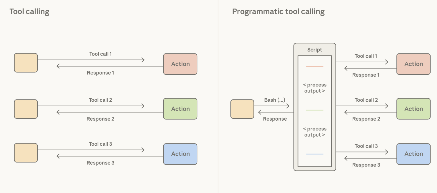 Giving Claude a code execution tool (e.g., bash tool or language-specific REPL) addresses this: it allows Claude to write code to express tool calls and the logic between them. Rather than the harness deciding that every tool call result is processed as tokens, Claude decides what results to pass through, filter, or pipe into the next call without touching the context window. Only the output of code execution reaches Claude’s context window.