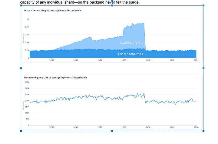 When a key crosses the hot threshold, the dispatcher serves it from a process-local LRU cache. Entries expire after roughly three seconds, so they vanish as soon as demand cools; no global cache is required. A cache miss can still arrive multiple times in the same millisecond, so the dispatcher tracks in-flight reads for hot keys. New arrivals attach to the pending future; the first backend response then fans out to all waiters. In most cases only one request per hot key per dispatcher pod ever reaches the storage layer.