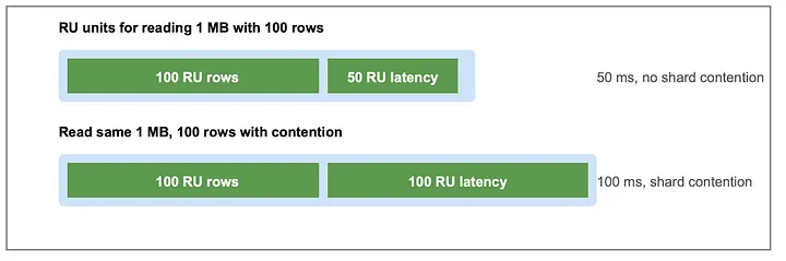A request unit blends four observable factors: fixed per-call overhead, rows processed, payload bytes, and — crucially — latency. Latency captures effects that rows and bytes alone miss: two one-megabyte reads can differ greatly in cost if one hits cache and the other triggers disk. In practice, we use a linear model. For both reads and writes, the cost is: