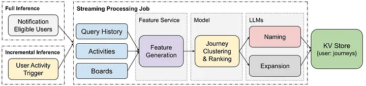 At a high level, we extract keywords from multiple sources and employ hierarchical clustering to generate keyword clusters; each cluster is a journey candidate. We then build specialized models for journey ranking, stage prediction, naming, and expansion. This inference pipeline runs on a streaming system, allowing us to run full inference if there’s algorithm change, or daily incremental inference for recent active users so the journeys respond quickly to a user’s most recent activities.