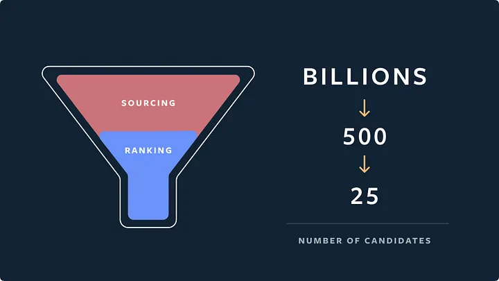 After creating the key building blocks necessary to experiment easily, identify people’s interests effectively, and produce efficient and relevant predictions, we had to combine these systems together in production. Utilizing IGQL, account embeddings, and our distillation technique, we split the Explore recommendation systems into two main stages: the candidate generation stage (also known as sourcing stage) and the ranking stage.