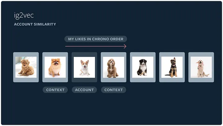 Because Instagram has a large number of interest-focused accounts based on specific themes — such as Devon rex cats or vintage tractors — we created a retrieval pipeline that focuses on account-level information rather than media-level. By building account embeddings, we’re able to more efficiently identify which accounts are topically similar to each other. We infer account embeddings using ig2vec, a word2vec-like embedding framework. Typically, the word2vec embedding framework learns a representation of a word based on its context across sentences in the training corpus. Ig2vec treats account IDs that a user interacts with — e.g., a person likes media from an account — as a sequence of words in a sentence.