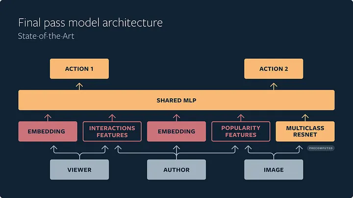 If the first-pass distillation model mimics the other two stages in ranking order, how do we decide the most relevant content in the next two stages? We predict individual actions that people take on each piece of media, whether they’re positive actions such as like and save, or negative actions such as “See Fewer Posts Like This” (SFPLT). We use a multi-task multi-label (MTML) neural network to predict these events. The shared multilayer perceptron (MLP) allows us to capture the common signals from different actions.