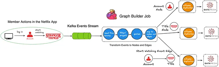 3. Transform events into graph primitives — nodes representing entities (e.g., member accounts and show/movie titles), and edges representing relationships or interactions between them. In this example, the diagram only shows a few nodes and an edge to keep things simple. However, in reality, we create and update up to a few dozen different nodes and edges, depending on the member actions that occurred within the Netflix app.