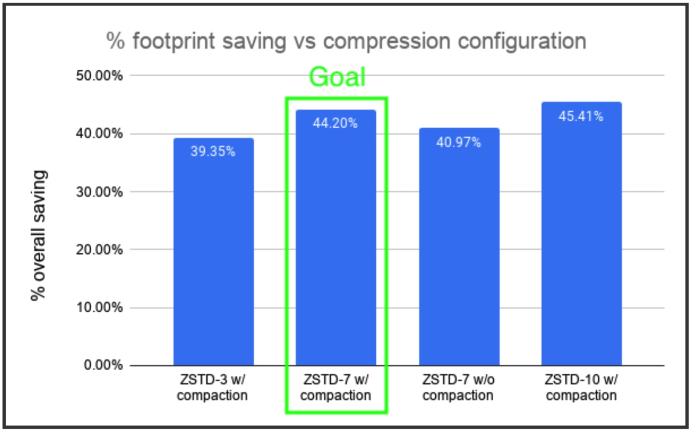 We looked into ways to reduce the footprint for old data. We experimented with batching data cells (e.g., a trip) and applying different compression methods on the application level so we could tune compressibility based on the application’s expected performance. This also resulted in less read/write amplification for backfill jobs, which we will discuss later. We explored different compression methods with different configurations for different use cases. We found that the ZSTD compression algorithm can obtain up to 40% overall saving when we batch and compress a number of cells together.