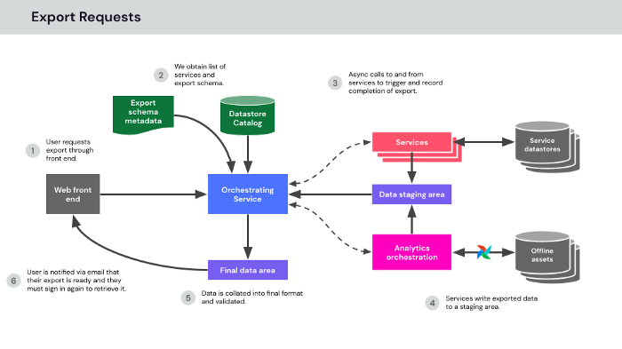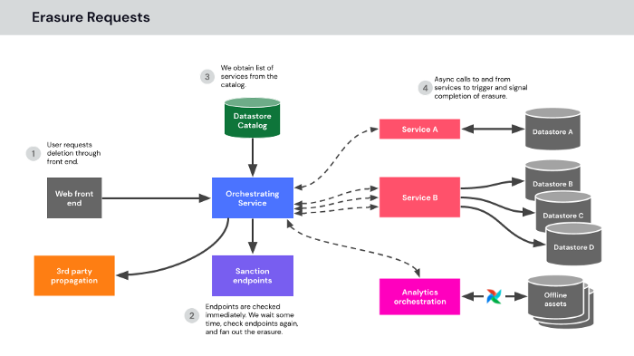 Thus, we decided on a federated design with a central orchestrating service that communicates with all other services involved in exporting/deleting data. We wanted teams to own their data and its lifecycle, and to give them the flexibility to add additional data hygiene tasks into the erasure process.