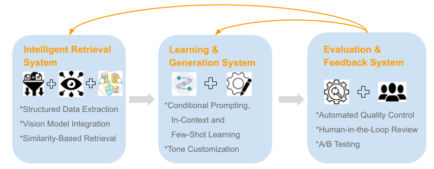 为了解决这个问题,我们设计了一个生产级的人工智能系统,它不仅仅生成平凡的描述。相反,它将数据检索、个性化生成和持续质量评估结合在一起。如图1所示,我们的创新在于如何将三个支柱系统结合成一个强大的管道: