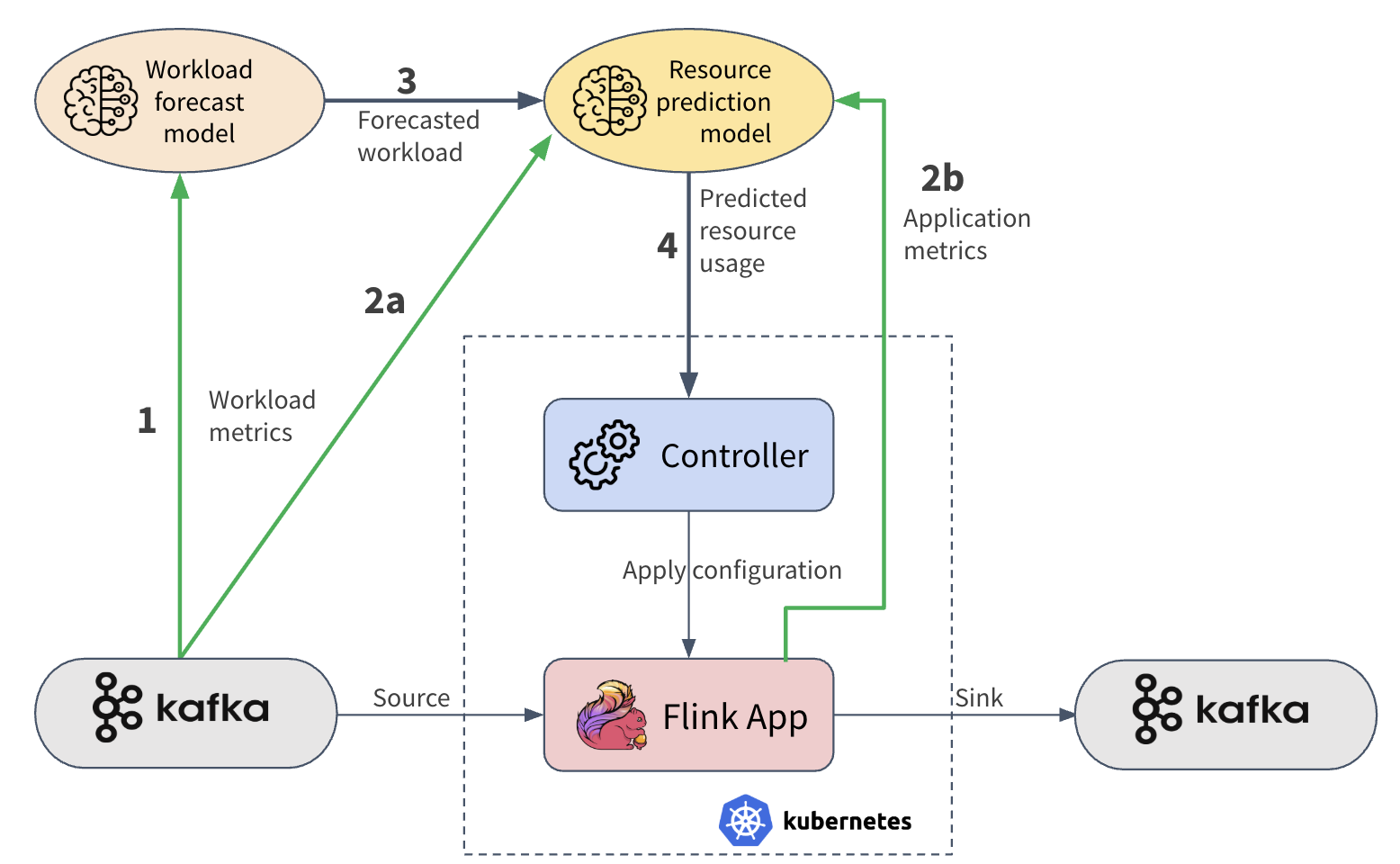 The forecasted workload (3) is fed into the resource prediction model to estimate the CPU usage required to handle that workload. The predicted value is then refined using custom safety feature adjustments to account for variability and ensure stability. This adjusted prediction is passed to the custom autoscaler controller, which evaluates the current CPU configuration of the TaskManager deployment. If the adjusted predicted value differs from the existing CPU configuration, the controller initiates vertical scaling to update the TaskManager deployment accordingly.